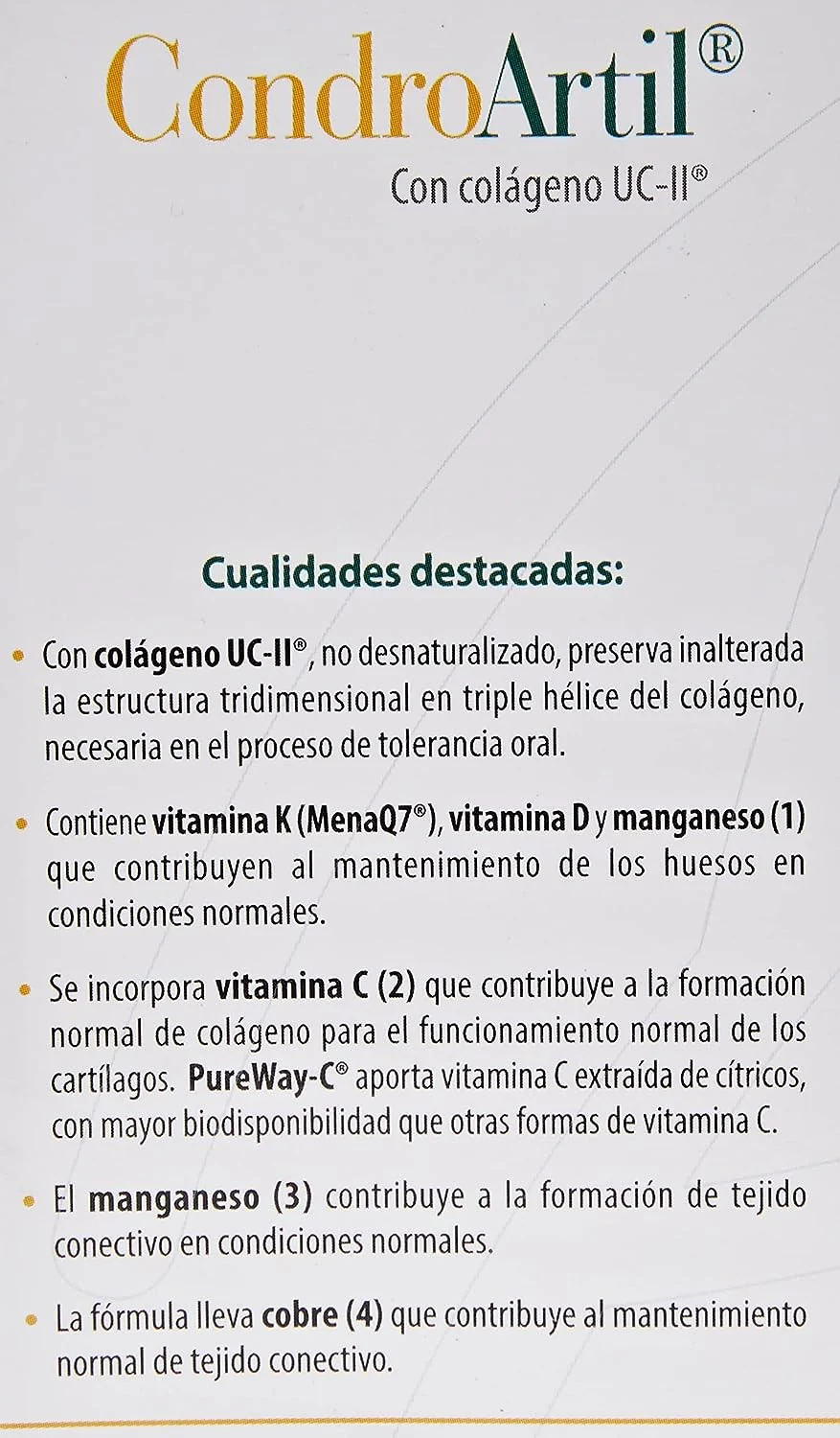 Complemento alimenticio 100% natural con colágeno UC-II. Contiene vitaminas C, D3 y K2, cobre y manganeso. ¡Mejora tu salud de forma segura y natural!