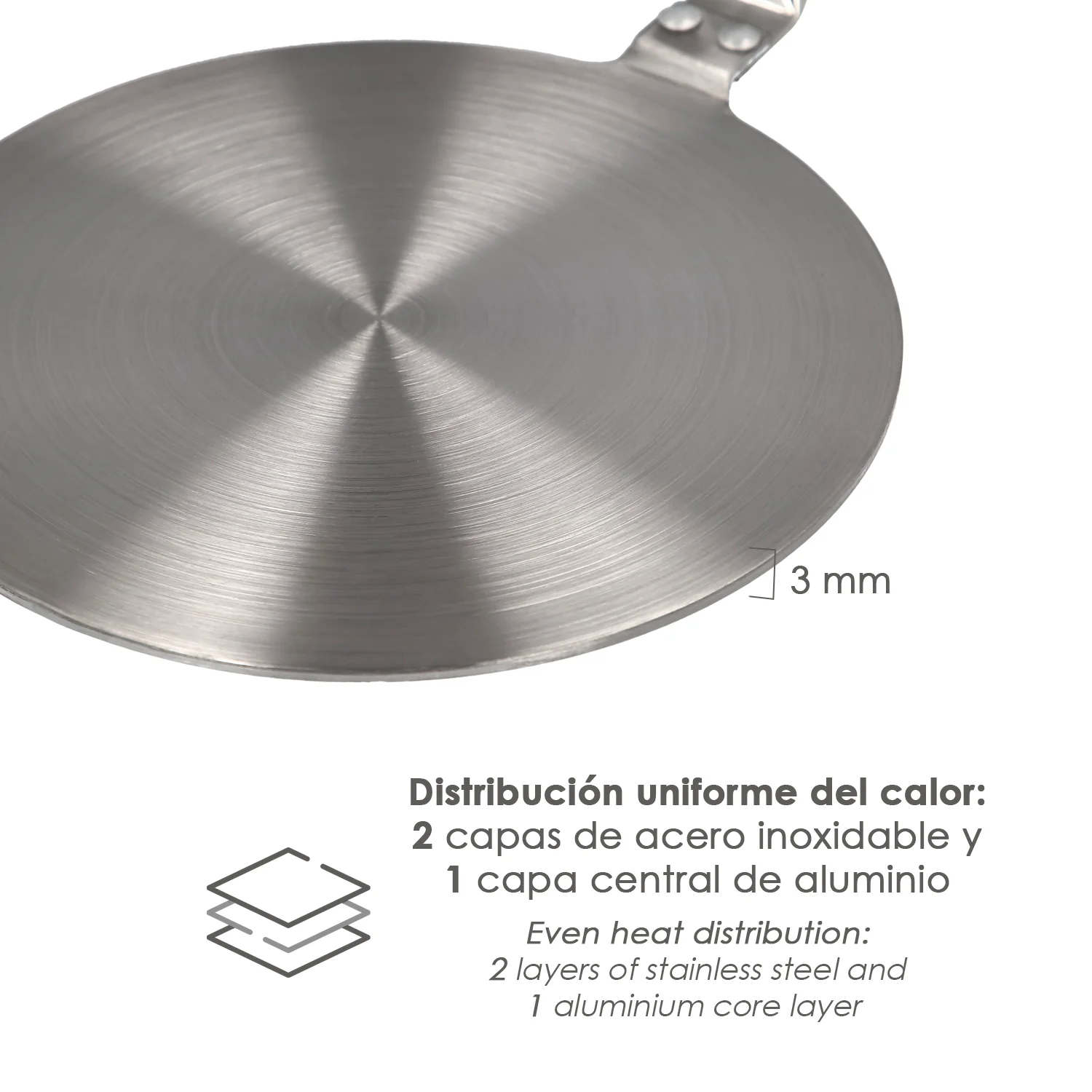 - Fabricado en 3 capas, 2 exteriores de acero inoxidable y una central de aluminio
