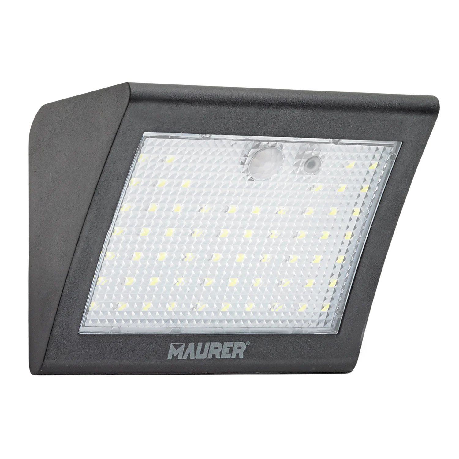 Aplique Solar Led 250 lúmenes INSTALACIÓN: La lámpara debe montarse sobre una superficie lisa y vertical. El panel necesita luz solar para poder recargarse, no colocar en interiores o zonas oscuras. En el primer uso es necesaria una carga de 8 horas para ser usada por primera vez. MODOS DE FUNCIONAMIENTO: Modo 1. Solo sensor de movimiento, para activar este modo debe pulsar 1 vez el botón de encendido/apagado. En este modo la luz se enciende a máxima potencia cuando detecta movimiento, la luz permanece activa durante 15 segundos. Modo 2. Sensor de movimiento con sensor de luz, para activar este modo debe pulsar 2 veces el botón de encendido/apagado. En este modo la luz se enciende a baja intensidad cuando cae la noche y cuando detecta movimiento a máxima potencia cuando detecta movimiento, la luz permanece activa durante 15 segundos. Modo 3 Luz siempre encendida, para activar este modo debe pulsar 3 veces el botón de encendido/apagado. Para apagar la lámpara debe pulsar 4 veces el botón de encendido/apagado de la marca MAURER.