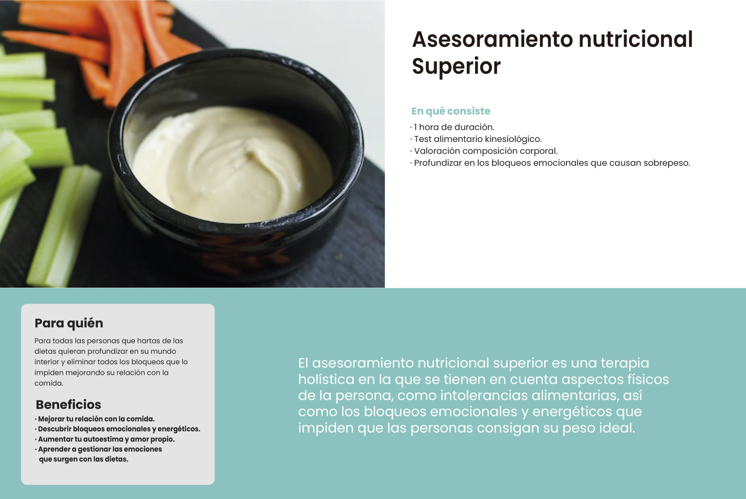 El asesoramiento nutricional superior es una terapia holística en la que se tienen en cuenta aspectos físicos de la persona, como intolerancias alimentarias, así como los bloqueos emocionales y energéticos que impiden que las personas consigan su peso ideal. Valoraremos la composición corporal, peso, líquidos, masa muscular, porcentaje de grasa corporal y la grasa visceral. Esta última es especialmente importante ya que es la grasa acumulada que recubre los órganos pudiendo llegar a entorpecer la funcionalidad del mismo. Mediante test kinesiológico (test no invasivo) se prueban los bloqueos que puedan causar el sobrepeso: desarreglos hormonales, resistencia a la insulina, malas digestiones, intolerancias alimentarias o bloqueo en órganos que saturan de toxinas el cuerpo. En el caso de que haya intolerancias alimentarias, mediante el mismo test se averigua que alimentos concretos son los que le sientan mal al cliente produciendo malas digestiones, hinchazones, retención de líquidos así como una tendencia a acumular más grasa de la debida. Por otro lado se gestionan las emociones asociadas a todo el proceso de pérdida de peso. Si se pierde y se vuelve a coger con el paso del tiempo, que la comida y tu cuerpo esté de manera constante en tu cabeza, si por mucho que lo intentas no pierdes más de X kilos. La falta de seguridad y autoestima hacen que tengas un imagen distorsionada de la realidad con respecto a tu cuerpo y como lo tratas. Mejorar todos estos aspectos hacen que el proceso de pérdida de peso sea mucho más duradero en el tiempo y lo más importante es que mejore la relación contigo, encontrándote a gusto con que ves delante del espejo tanto por fuera como por dentro.
