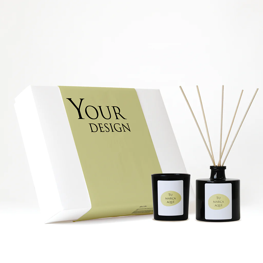 Caja regalo personalizado con fajín | Vela y mikado personalizados | Vaso cristal transparente/negro + etiqueta logo/diseño