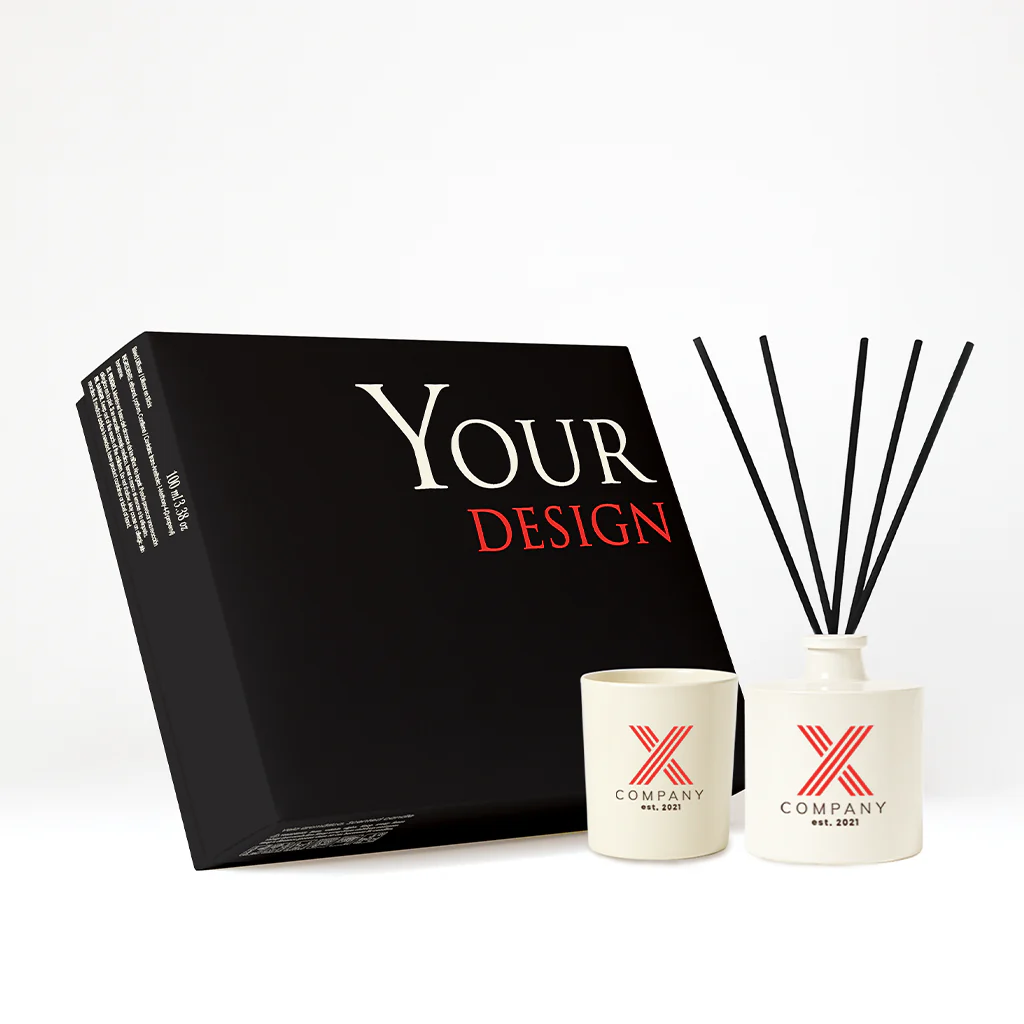 Caja regalo personalizado | Vela y mikado personalizado | Vaso cristal tintado + serigrafia logo/diseño