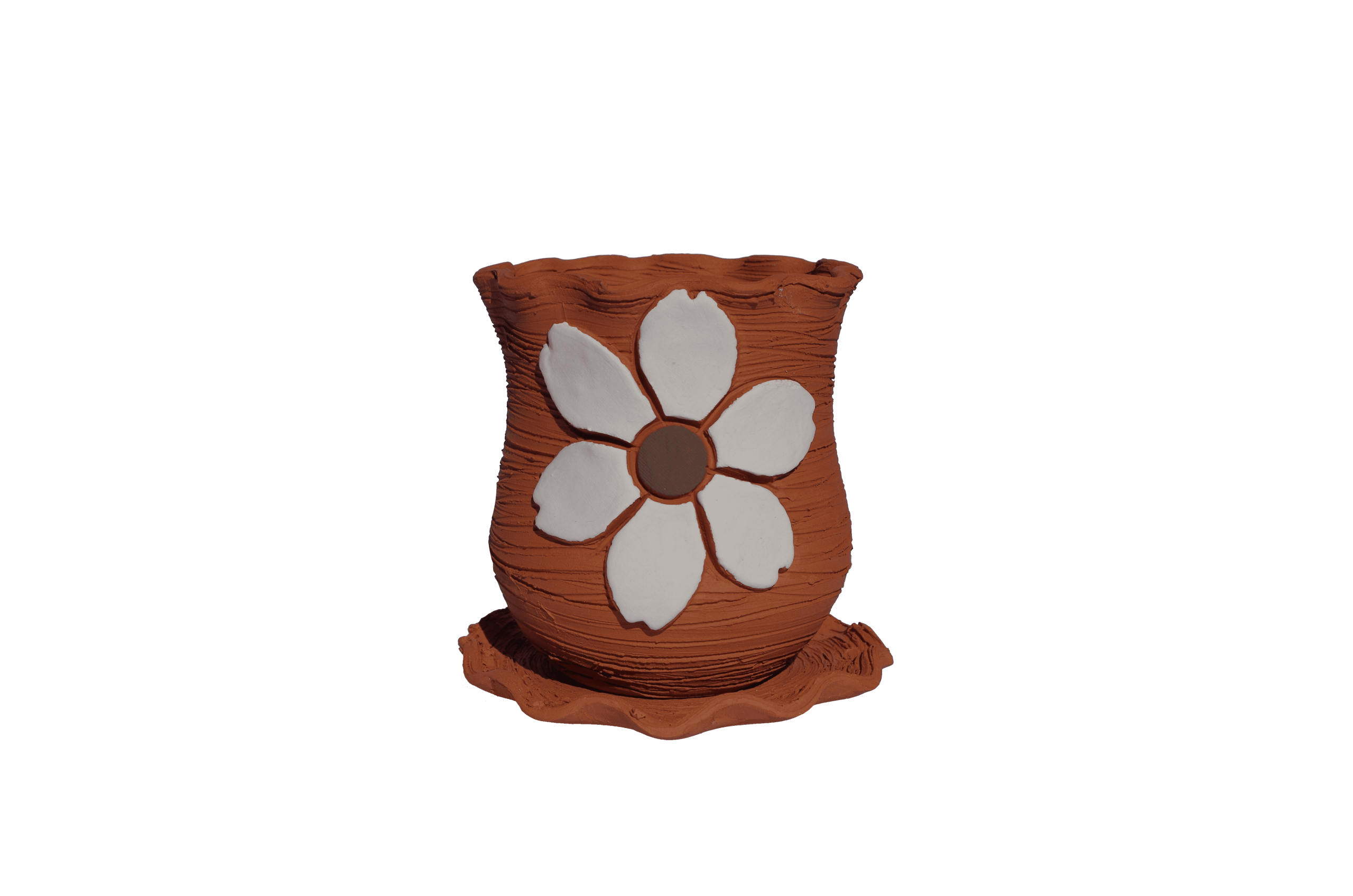 Maceta de barro para pequeñas plantas decorada con una flor blanca y acabado rizado.