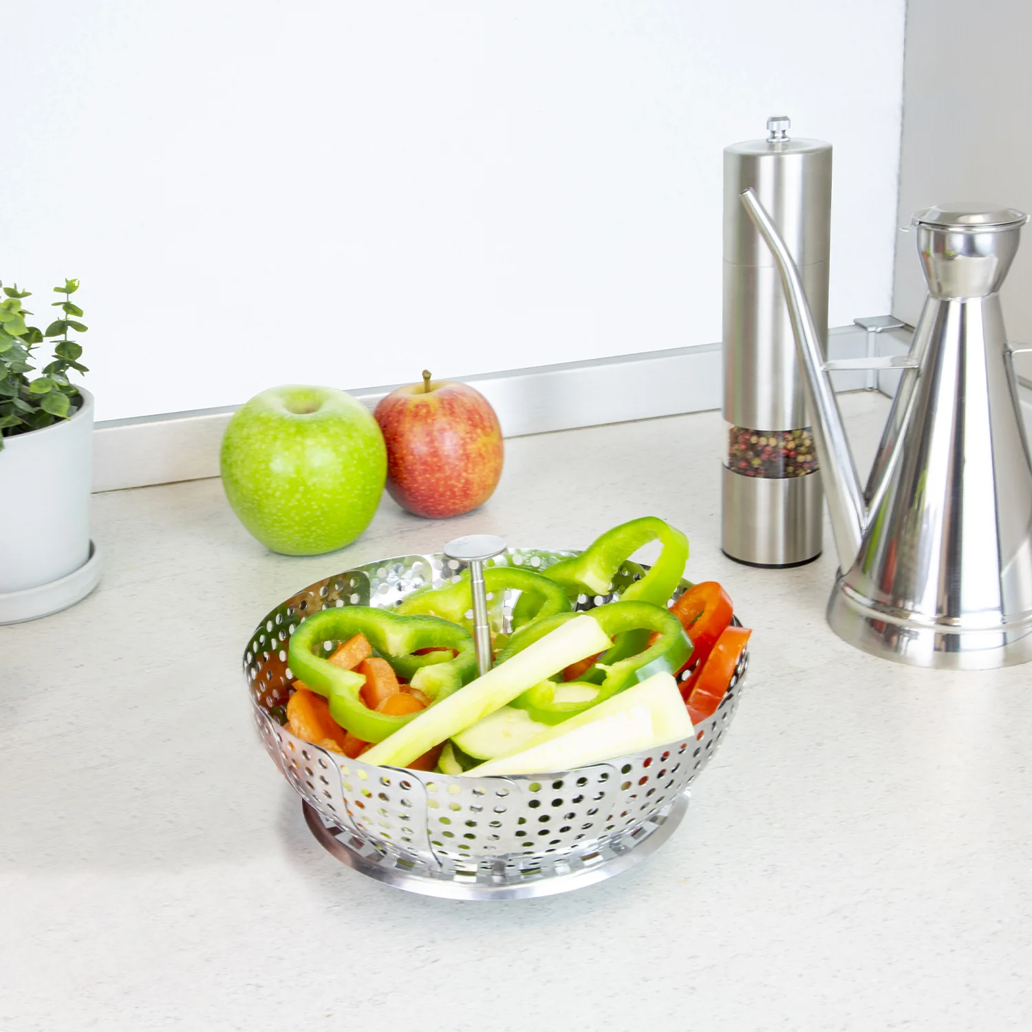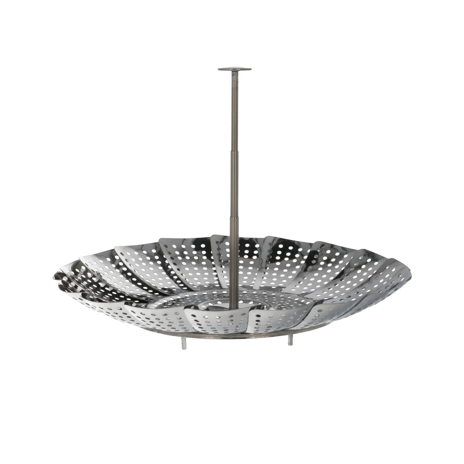 • Cesta vaporera plegable, fabricada en acero inoxidable, extensible entre 14 y 23 cm para adaptarse a todo tipo de recipientes