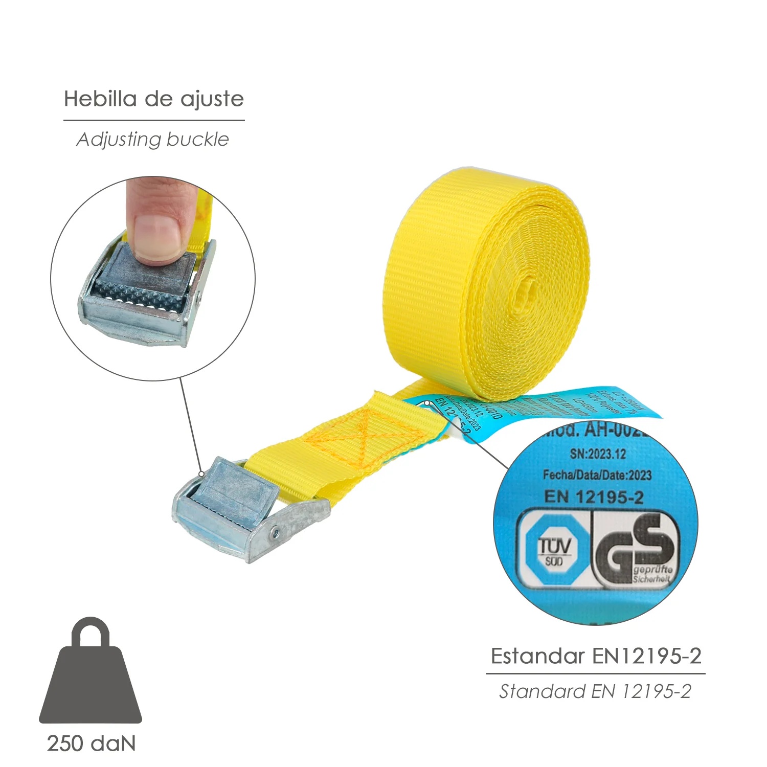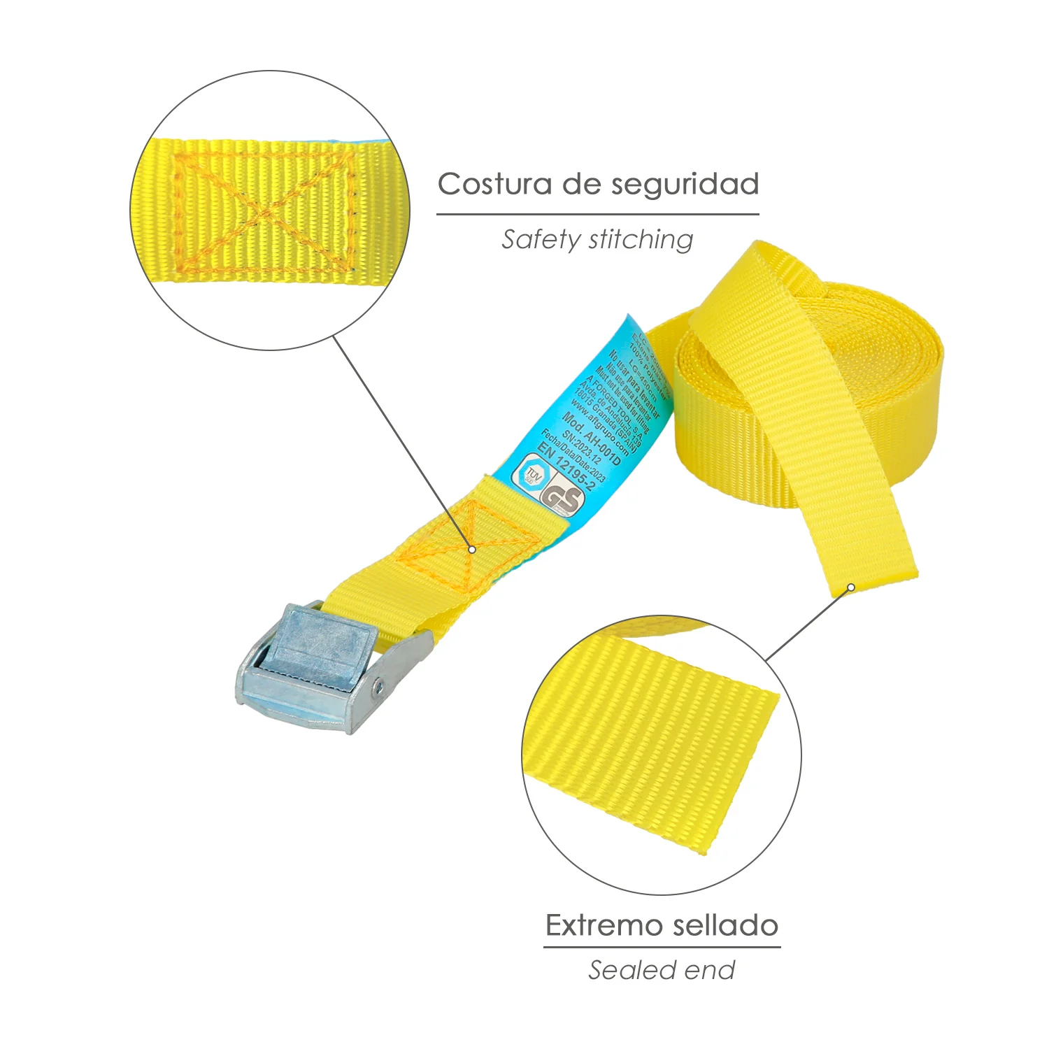 - Artículo también conocido como cincha, eslinga, amarradera, cinta de amarre, trinquete de amarre