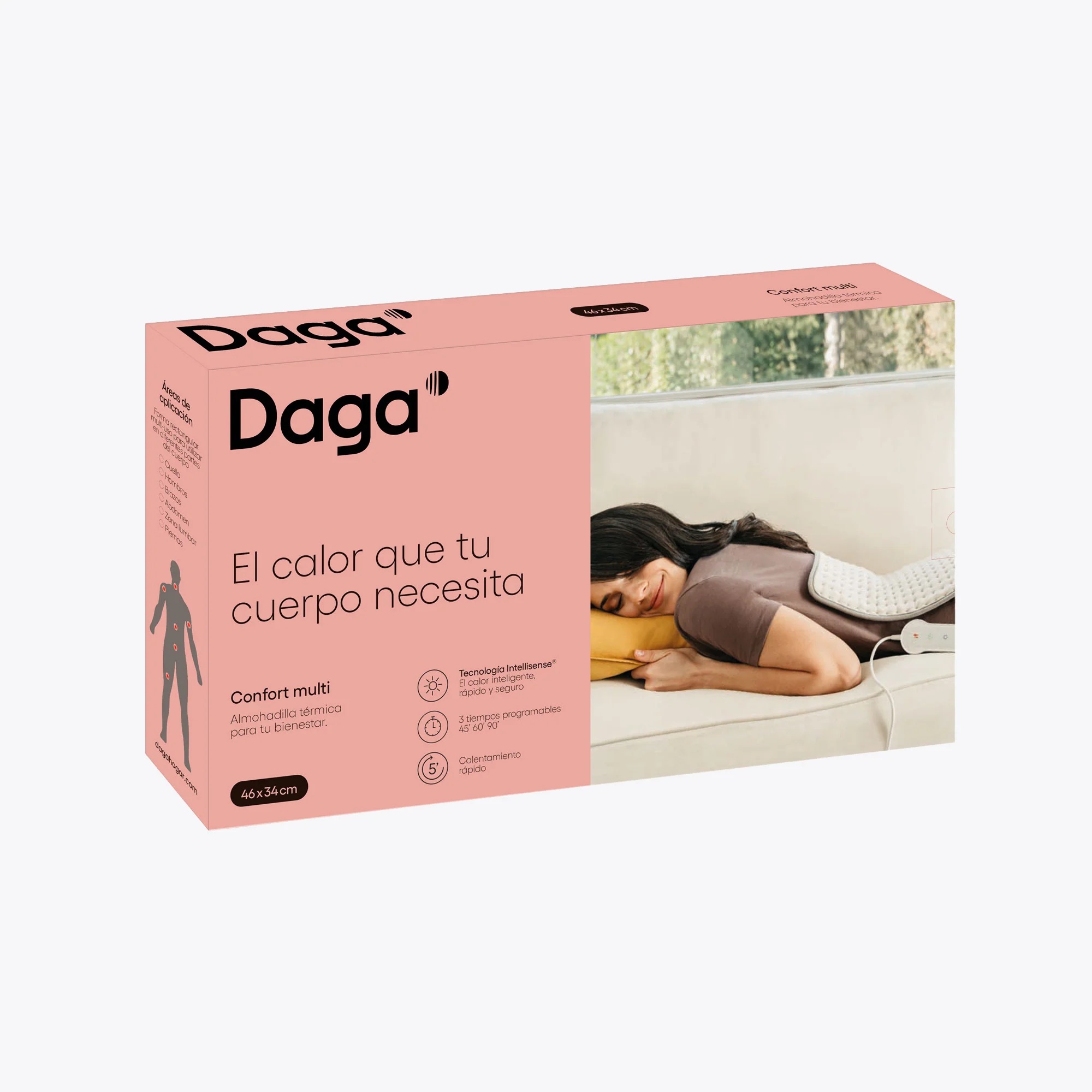 Daga Confort Multi es la almohadilla térmica que tu cuerpo necesita. Con su forma multiuso se adapta perfectamente a las diferentes partes, y con la tecnología Intellisense®, constantemente a tu temperatura corporal, a la del entorno y a tus necesidades. La almohadilla térmica Daga consume poquísimo.