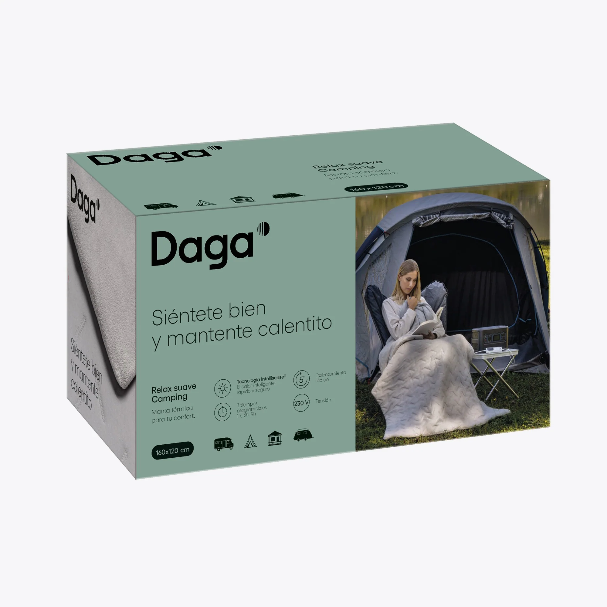 Daga Relax Suave Camping se adapta a los espacios interiores reducidos de autocaravanas, caravanas, tiendas y bungalows para descansar o relajarse al calor con total comodidad, manteniendo el calor concentrado donde más se necesita. Tejido acolchado ultrasuave combinado con una cara inferior aterciopelada y cálida, agradable al tacto, confortable y fácil de limpiar. La tecnología Intellisense®, 6 temperaturas, multitemporizador y máxima seguridad. Incluye bolsa para guardar la manta.