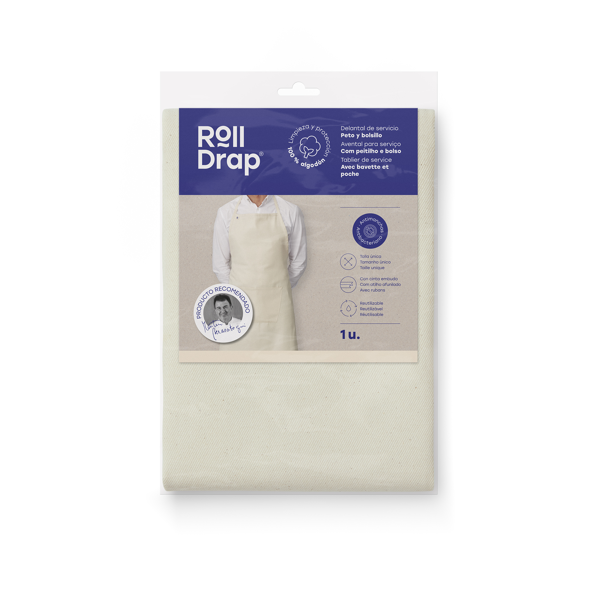 Este delantal con bolsillo color Natural ROLL DRAP tiene un acabado antimanchas – protect que asegura la durabilidad y limpieza del producto. Este tratamiento antimanchas y biocida previene la formación de cultivos bacterianos en el tejido. Además, la composición de este delantal con bolsillo color negro hace que sea un delantal totalmente libre de fluocarbonos.