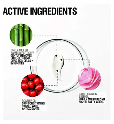 – FINELY MILLED BAMBOO PARTICLES: GENTLY REMOVE PORE-CLOGGING DEAD SKIN CELLS + IMPURITIES