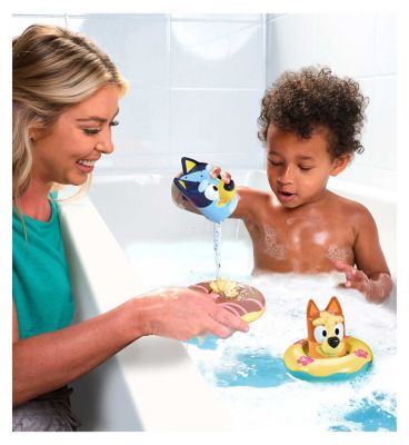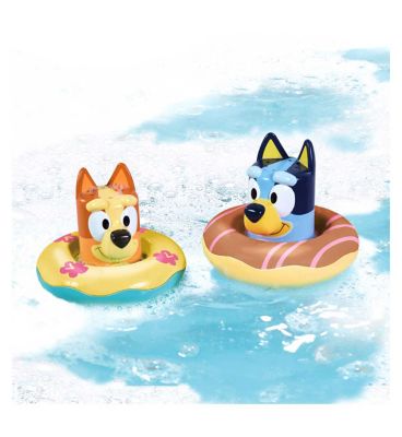 A Bluey y a su hermanita Bingo les encanta dar vueltas en la bañera o en la piscina infantil. ¡Además, sus anillos están decorados para que parezcan algunos de sus objetos favoritos! Un flotador parece un donut y el otro está cubierto de flores. Cada uno es un juguete de baño dos en uno con uno de sus personajes favoritos sentado encima. Simplemente levanta a Bluey y a Bingo y sumérgelos en las olas para que se llenen de agua. Luego, gira cada cabeza y vierte agua como si estuvieras sirviendo una taza de té, o rocía por los pequeños agujeros para un efecto de ducha. Debajo, en el centro de cada anillo, hay una rueda de paletas que gira al vaciar los vertedores y aspersores. Este producto de Toomies para preescolares, una adición a la gama Bluey, ayudará a desarrollar la confianza en el agua, la motricidad fina y demostrará la relación entre causa y efecto. Escurre completamente después de usar y deja secar al aire. Limpia con solución o toallitas antibacterianas. No necesita pilas. Apto para niños a partir de 18 meses.