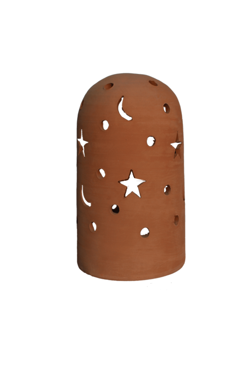 Lámpara de cerámica decorativa con ranuras en forma de luna y estrellas o corazones que dejan escapar la luz para iluminar jardines e interiores.