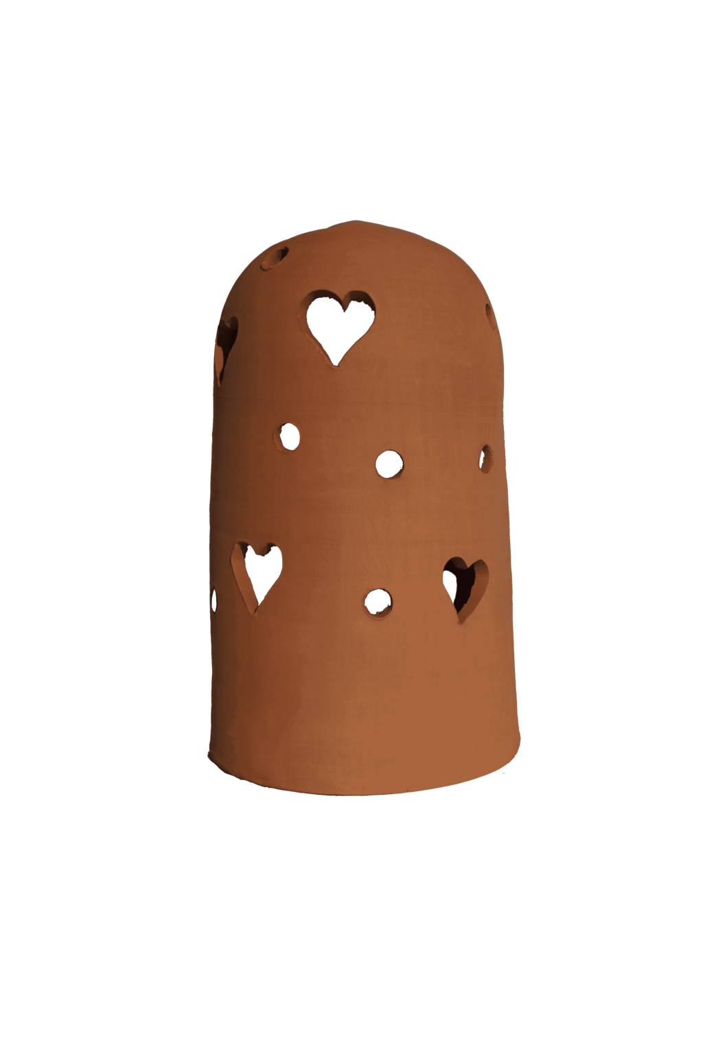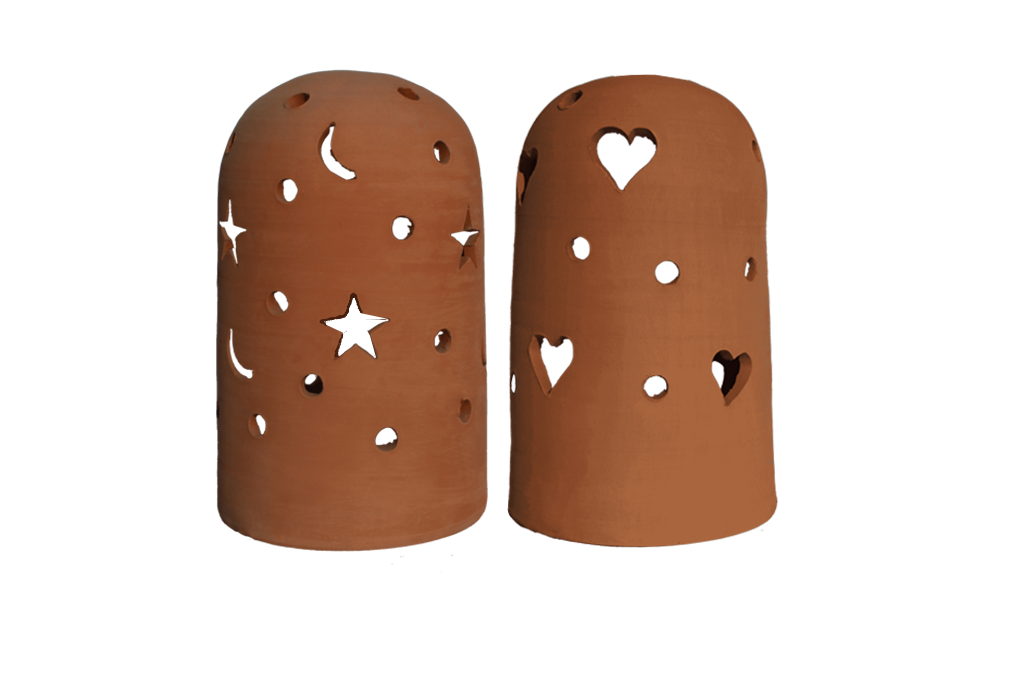La iluminación es una parte esencial en la decoración de espacios, ya sean interiores o exteriores. Si ya la elección de la bombilla puede llegar a hacerse difícil (luz cálida o fría, intensidad, de bajo consumo…), en lo que respecta a la propia lámpara mejor ni hablamos. En cuanto a las lámparas de cerámica, suelen ser únicamente de arcilla las bases y las tulipas de plástico o tela. Nuestra lámpara dedal está por completo fabricada con arcilla de calidad superior. Es una tulipa en sí, perforada con formas de lunas y estrellas o corazones, que deja pasar la luz creando un bello efecto que transmite satisfacción visual. La intensidad y color final dependerá de la bombilla escogida, pudiendo colocar incluso tiras de led dentro de la propia lámpara. Otra opción es colocar algún material translúcido, como papel celofán para cambiar el color de la luz a su gusto. Las combinaciones luminosas que se pueden crear gracias a este producto son enormes y muy personales, por eso hemos decidido no incluir pie o bombilla, ya que no queremos influir en el resultado final.