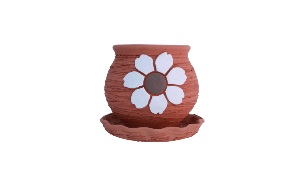 Maceta de barro esférica, decorada con una flor y pensada para cactus y pequeñas plantas de interior. Es un adorno perfecto e incluye el plato.
