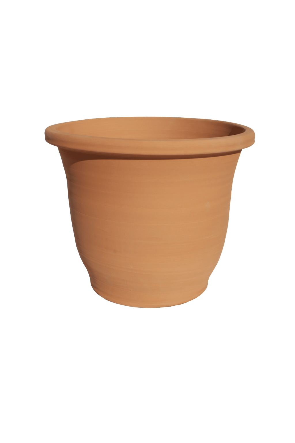 Maceta de barro con una línea estilizada que recuerda a una campana invertida.