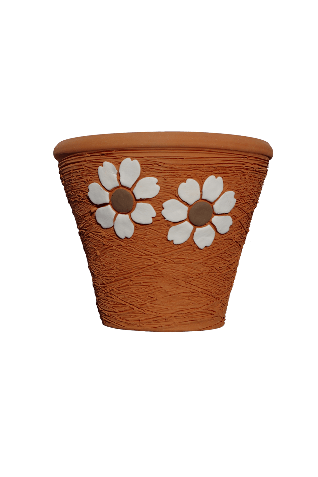 Maceta de barro decorativa hecha 100% a mano con textura rugosa y decorada con dos flores blancas.