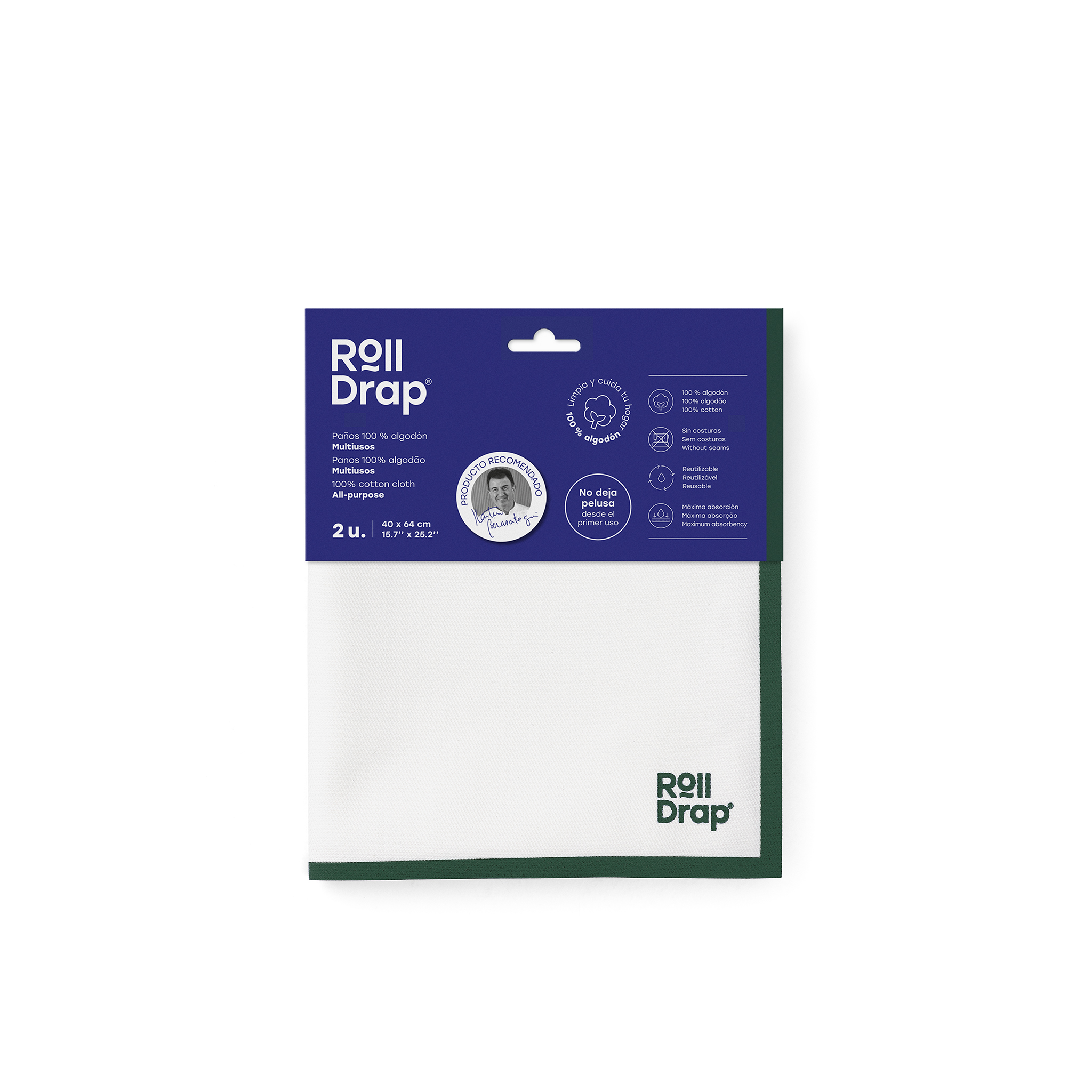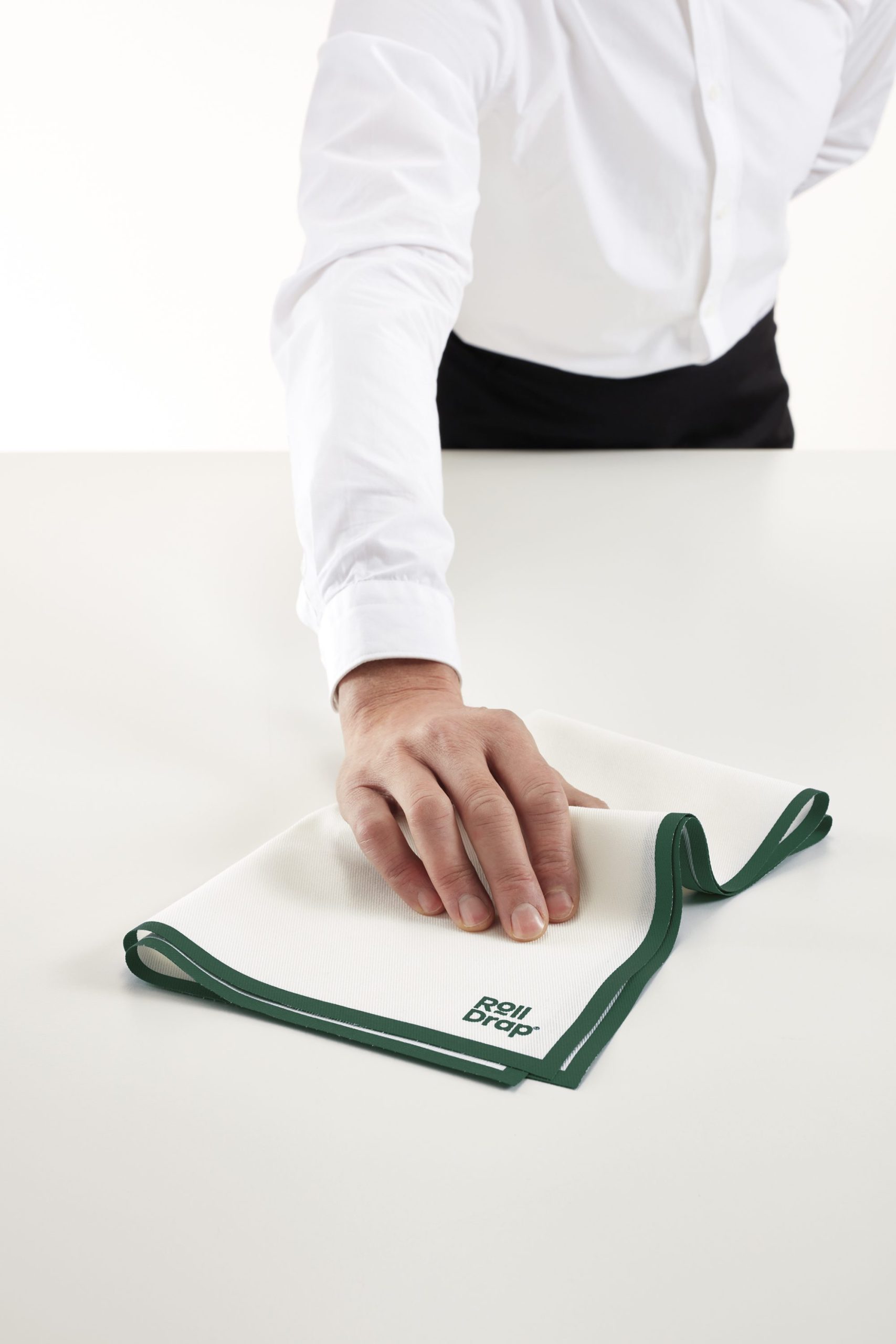Los paños de cocina ROLL DRAP multiusos son la mejor opción para repasar y abrillantar cristalería, vajillas y cubiertos. Estos paños de cocina color blanco con cenefa Verde están fabricados íntegramente con fibras naturales y con acabados técnicos e innovadores, ofreciendo así una solución textil sostenible y profesional apta para cualquier espacio de limpieza en su día a día.