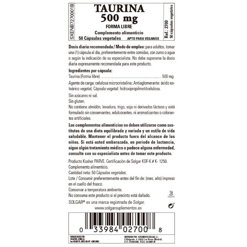 SOLGAR Taurina 500mg (50 Cápsulas vegetales)