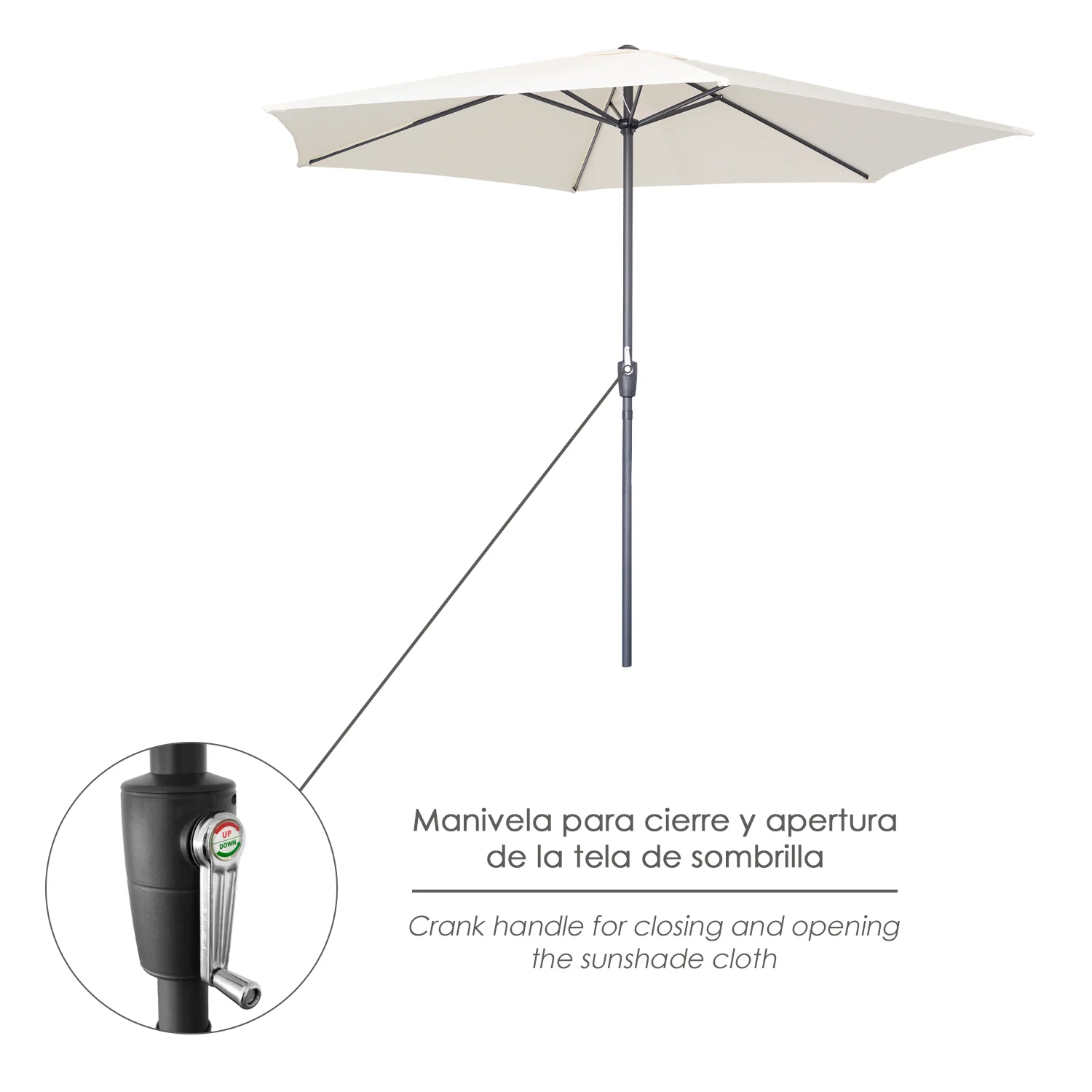 – Manivela antiretorno que facilia la apertura y el cierre de la sombrilla.