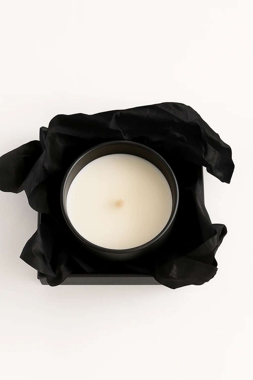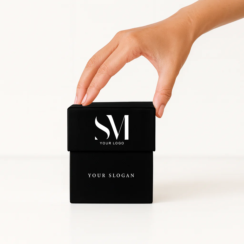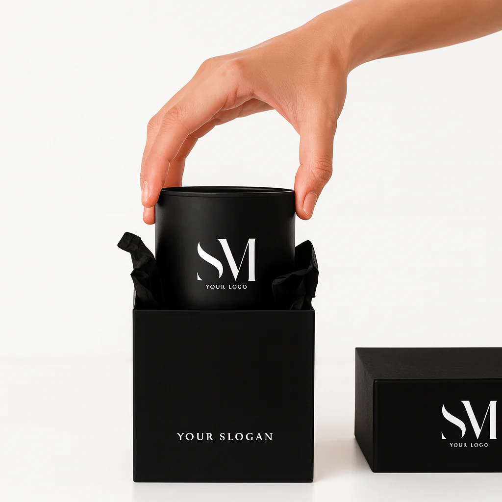 Vela 100% de cera de soja natural con una mecha de algodón trenzado encerado en la propia cera de soja. Esta vela es de 280g dura unas 70h. aprox. y el vaso mide 9,2 cm de alto x 8 cm de diámetro. El vaso va tintado en negro mate y lleva el logo del cliente en un color. La caja es una caja rígida forrada con papel con el diseño del cliente. La caja puede ir impresa por todas las caras exteriores. La caja cerrada mide: 10 cm x 10 cm x 10 cm. En el interior, la vela va envuelta con papel de seda de color blanco.