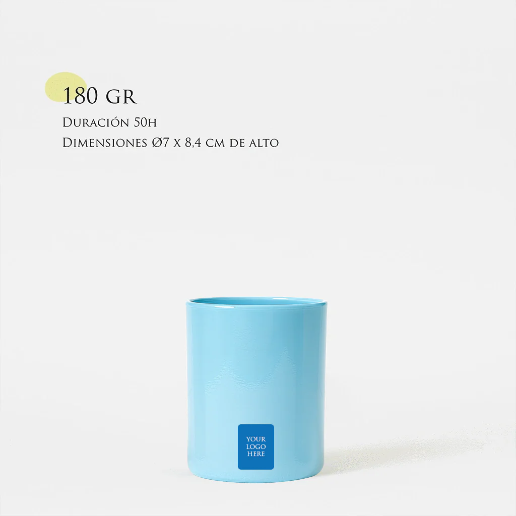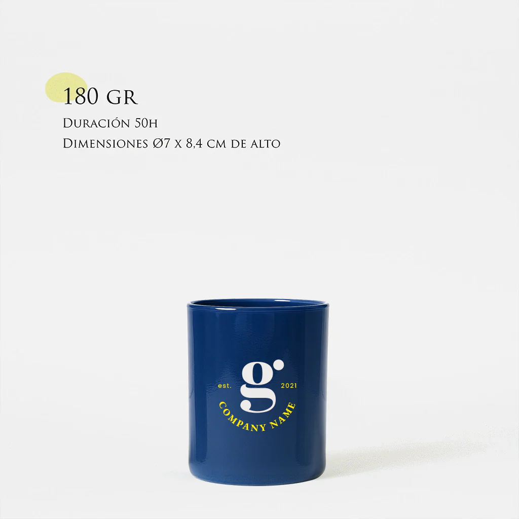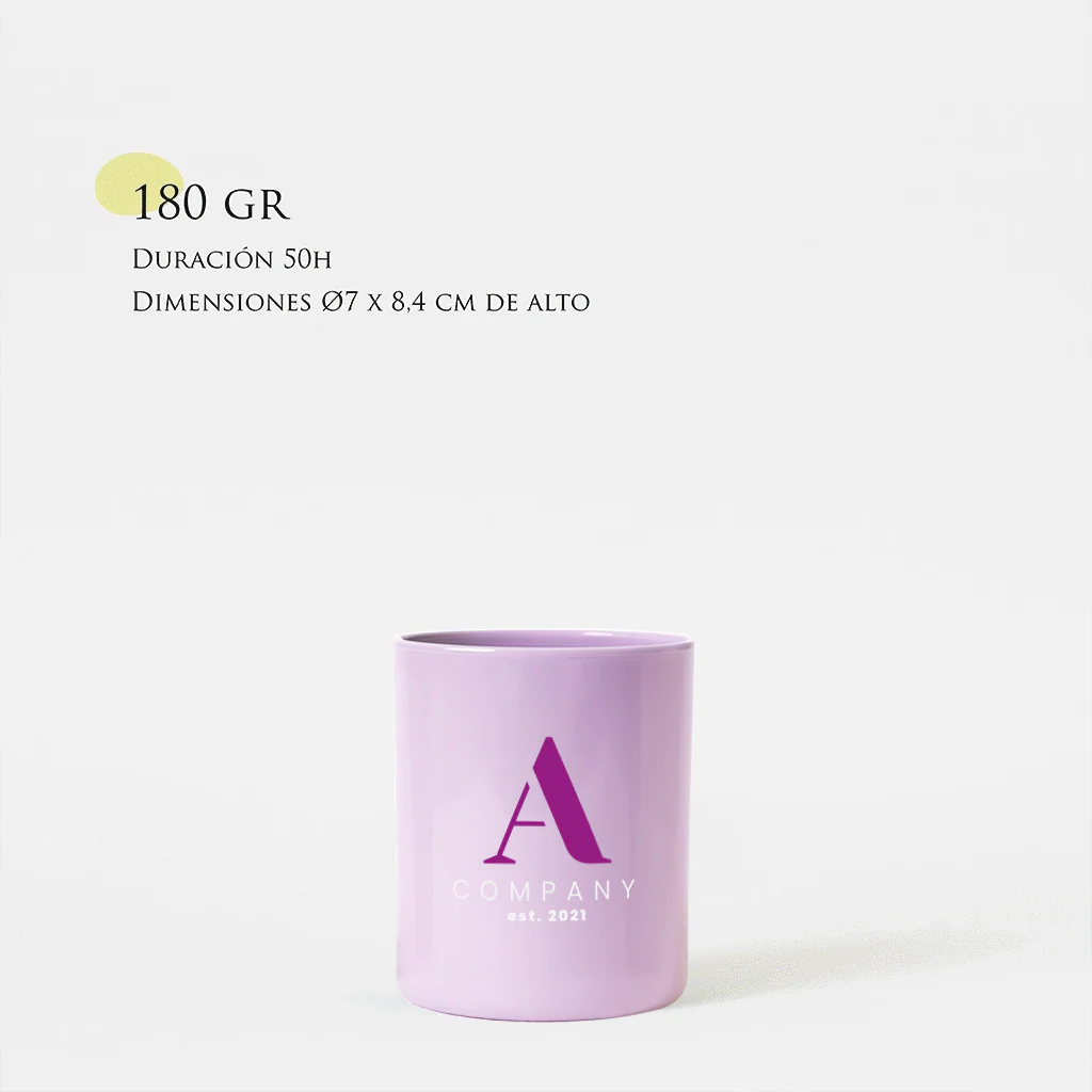 Vela 100% de cera de soja natural con una mecha de algodón trenzado encerado en la propia cera de soja. Esta vela es de 180g dura unas 50h. aprox. y el vaso mide 8,4 cm de alto x 7 cm de diámetro. El vaso va tintado en uno de los colores que damos a elegir y lleva el logo del cliente hasta en dos colores (cualquier color)