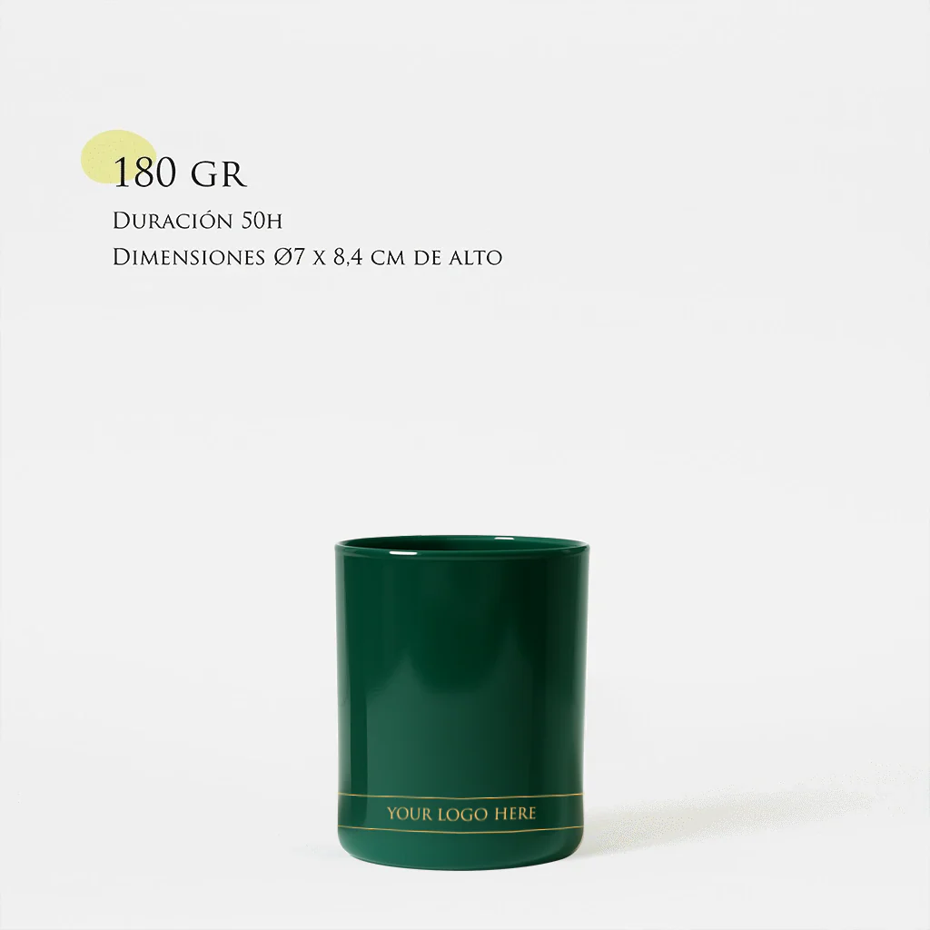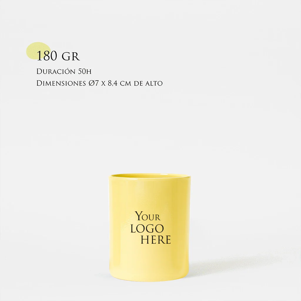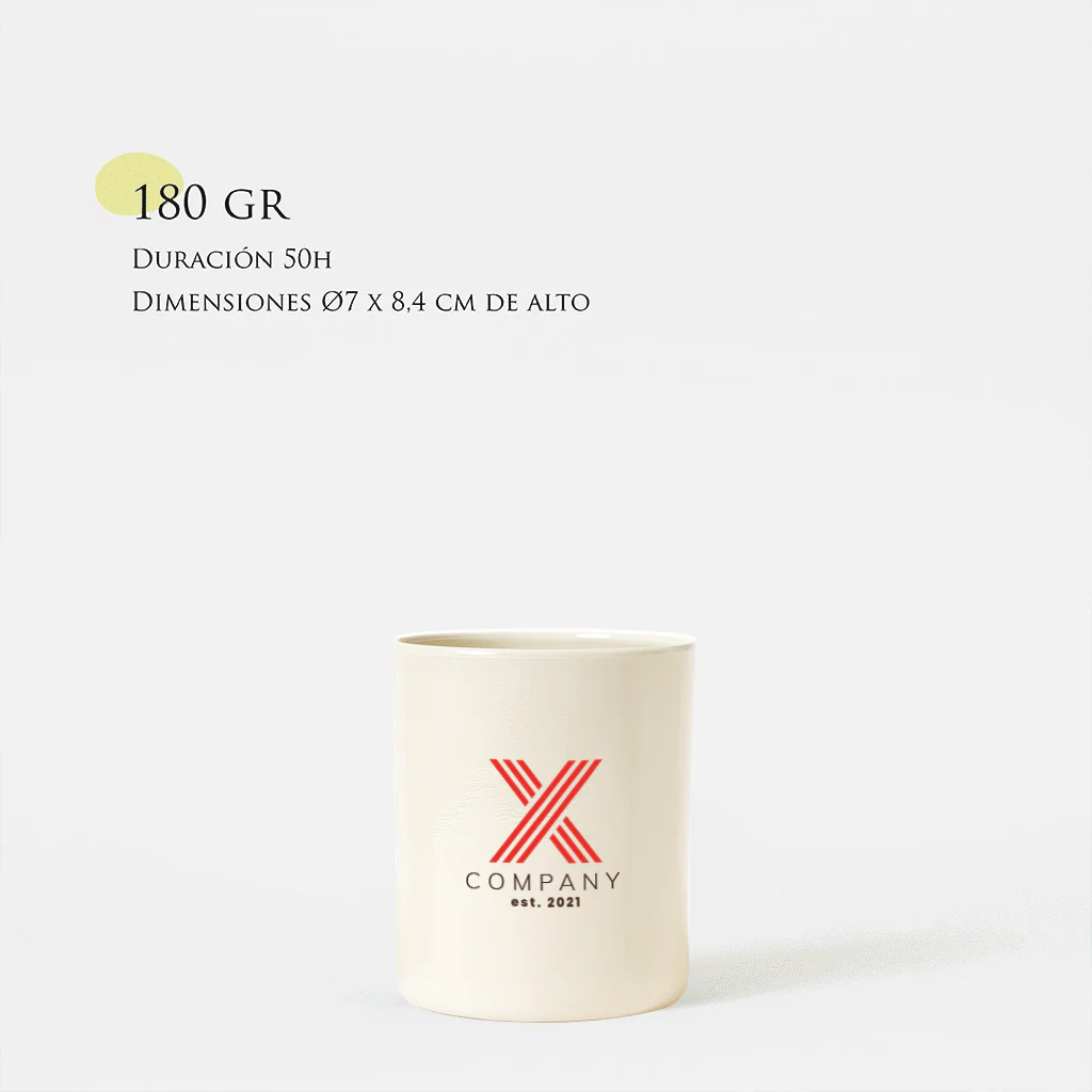 Vela 100% de cera de soja natural con una mecha de algodón trenzado encerado en la propia cera de soja. Esta vela es de 180g dura unas 50h. aprox. y el vaso mide 8,4 cm de alto x 7 cm de diámetro. El vaso va tintado en uno de los colores que damos a elegir y lleva el logo del cliente hasta en dos colores (cualquier color)