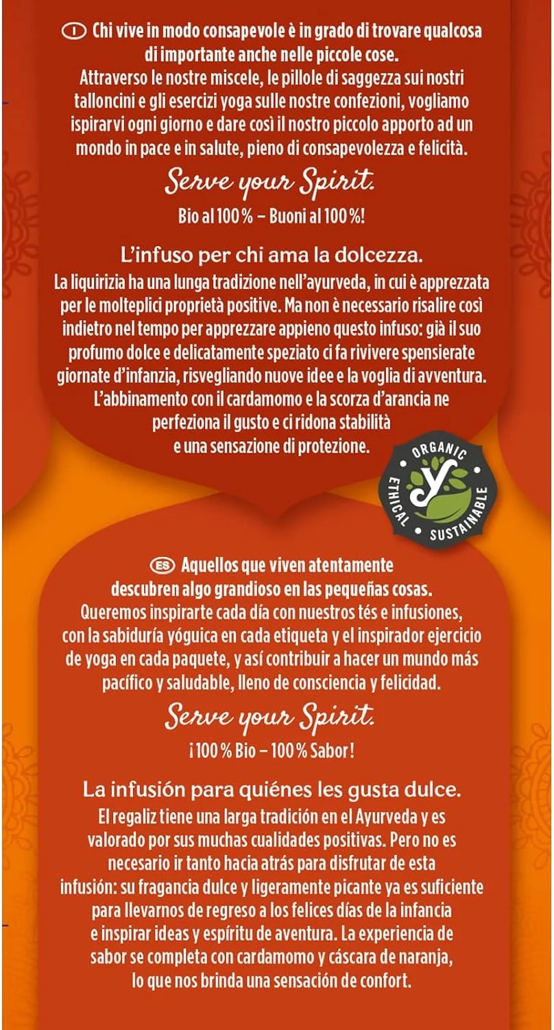 Descubre Yogi Tea Regaliz, una infusión ayurvédica con fragancia dulce y ligeramente picante. Disfruta de su sabor reconfortante con cardamomo y cáscara de naranja. Producto bio y vegano.