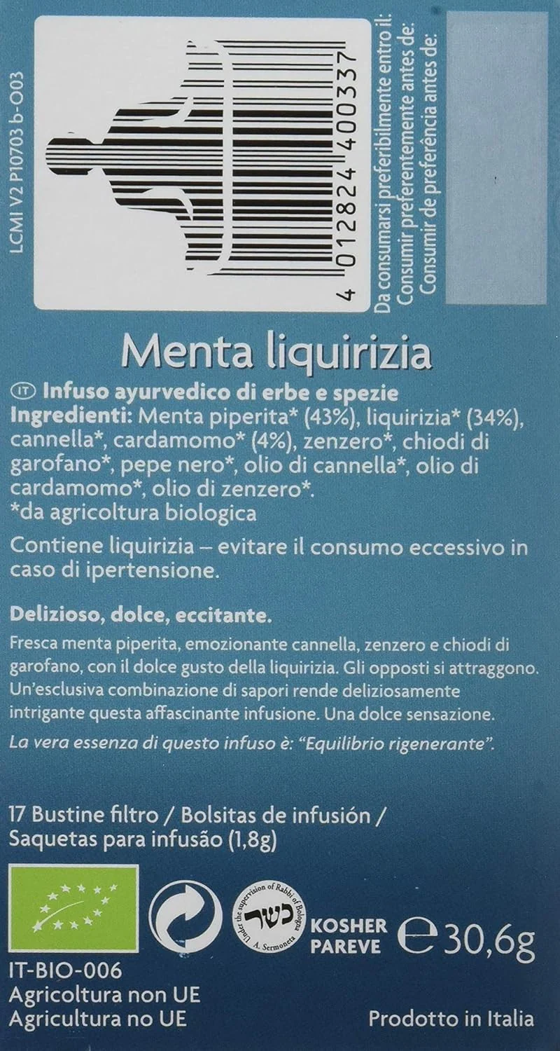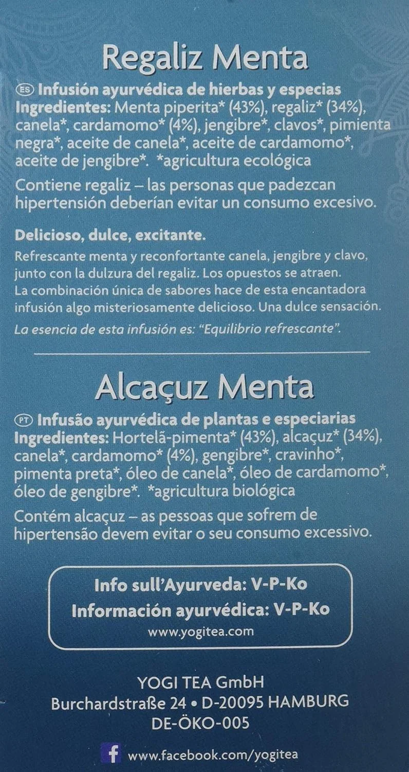 Yogi Tea Regaliz y Menta 17 Bolsitas. Mezcla única de hierbas y especias seleccionadas que estimula la vitalidad y la alegría de vivir. Aroma incomparable.