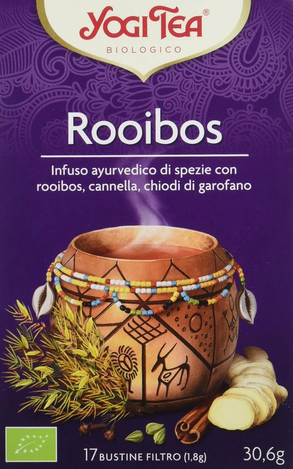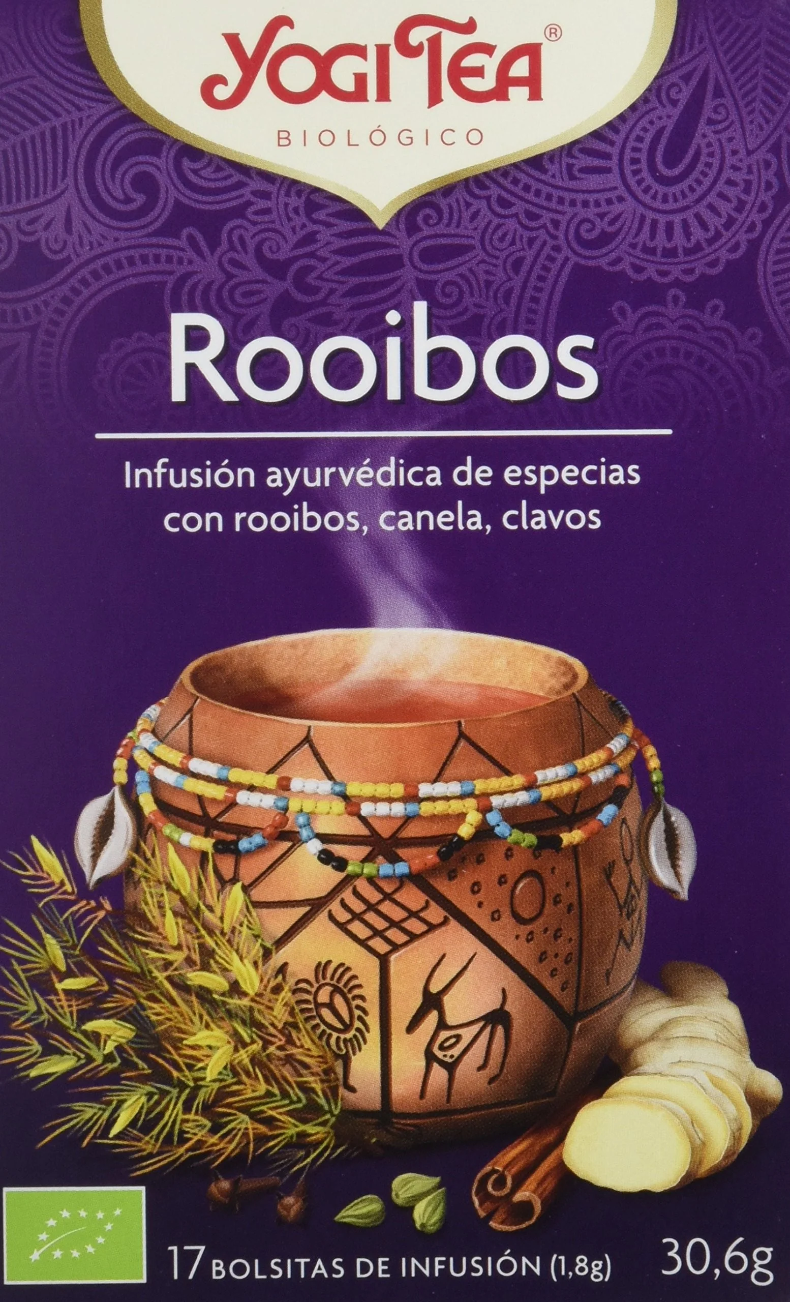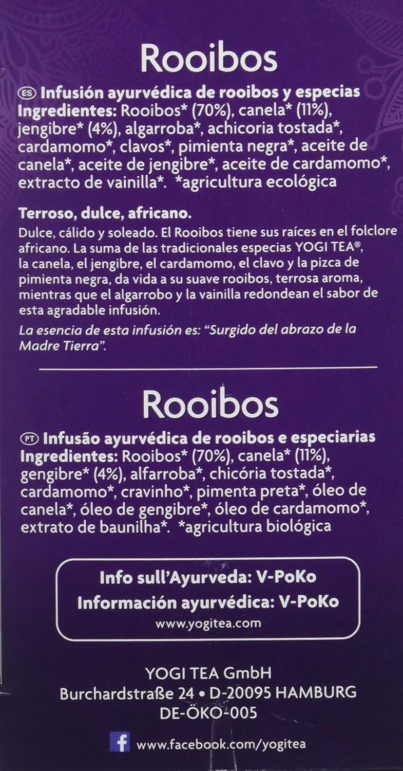 Yogi Tea Rooibos: Mezcla única de hierbas y especias que estimula la vitalidad y la alegría de vivir. Con ingredientes como rooibos, canela, jengibre y cardamomo. ¡Disfruta de su sabor incomparable!